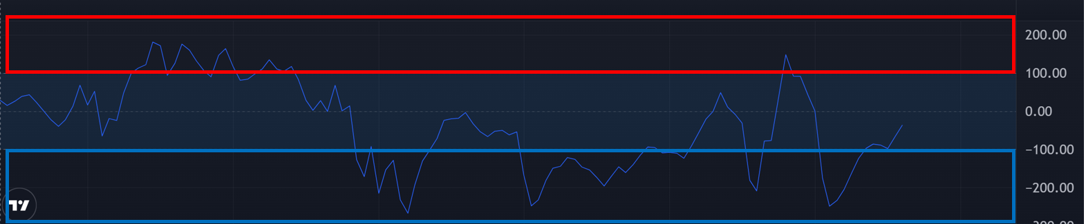 보통 CCI는 -100~100 사이를 왕복한다는 것이 기준이며, 이 값을 벗어다는 빨간 구간과 파란 구간은 과매수구간, 과매도구간이라고 불리며 이 구간에서는 다시 -100~100사이 구역으로 반드시 돌아온다고 분석한다.