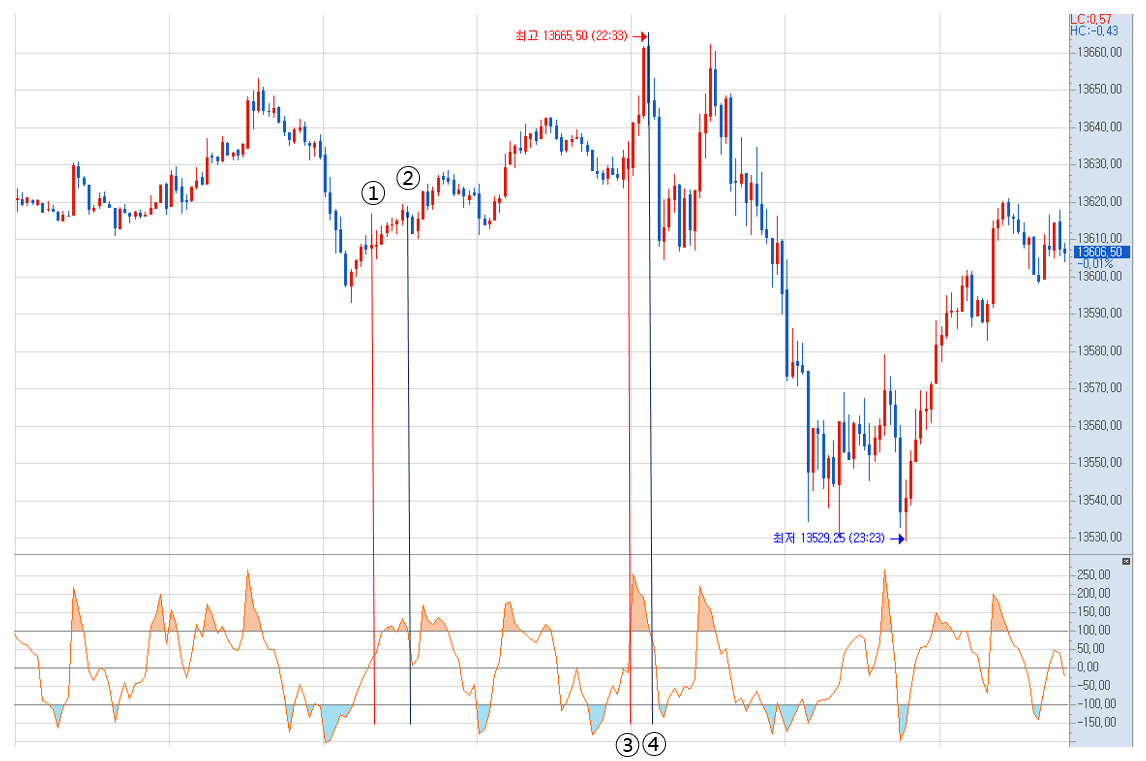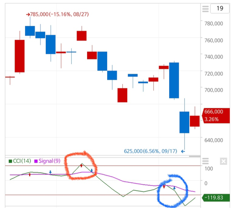3) CCI값이 +100이상이면 과매수 구간이고 -100이하면 과매도 구간이다.